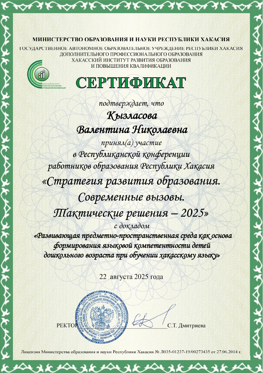 Республиканская конференция работников образования Республики Хакасия "Стратегия развития образования. Современные вызовы.Тактические решения- 2025" с докладом "РППС, как основа формирования языковой компетентности детей дошкольного возраста при обучении хакасскому языку"