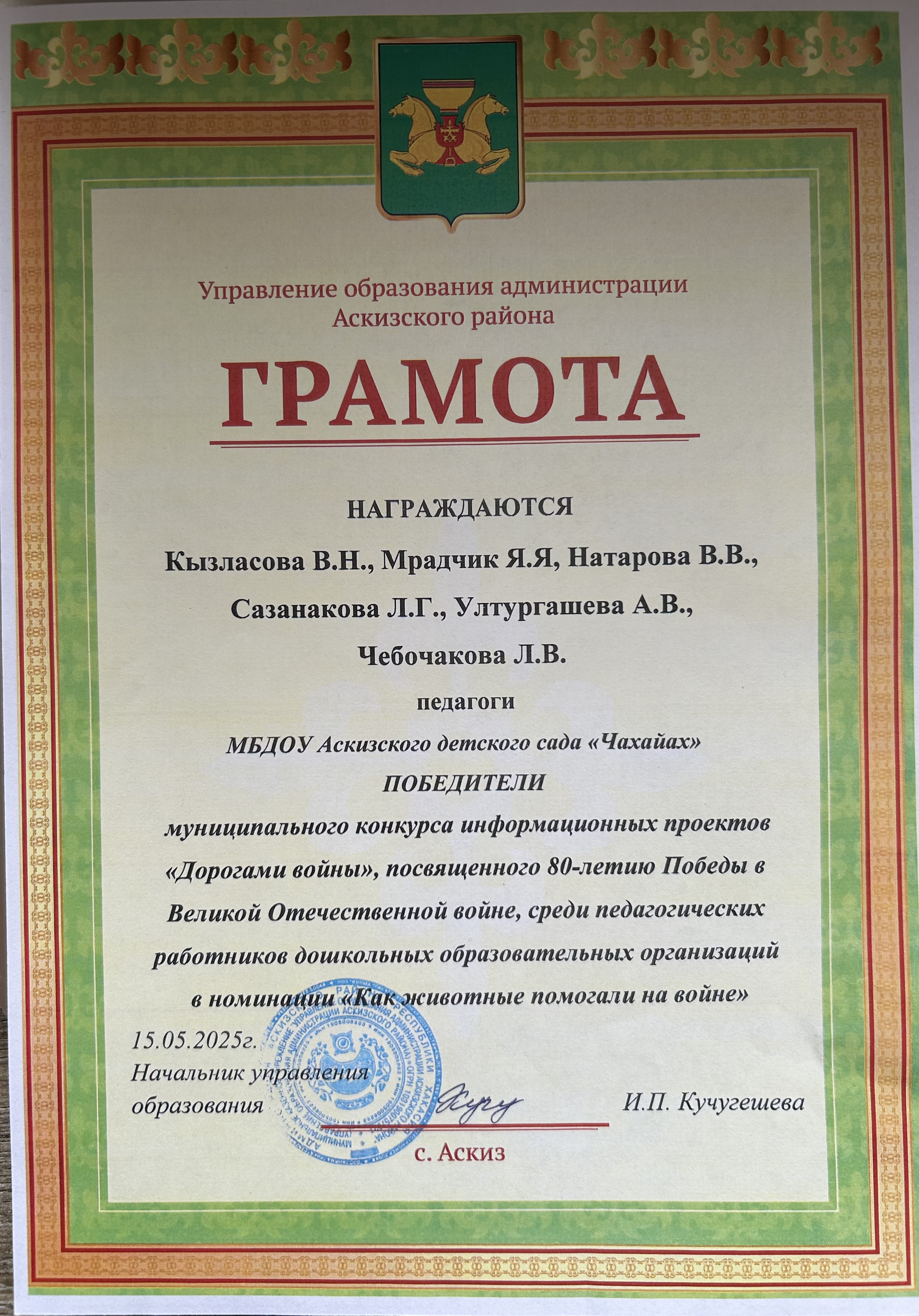 Грамота Победители муниципального конкурса информационных проектов "Дорогами войны" посвященный 80- летию Победы в Великой Отечественной войне , среди педагогических работников ДОО в номинации "Как животные помогали на войне"