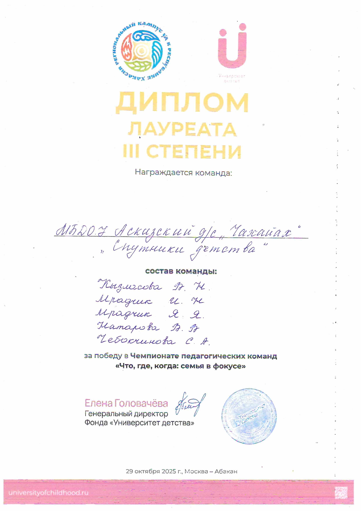 Диплом Лауреата III Cтепени за победу в Чемпионате педагогических команд "Что? Где? Когда?:семья в фокусе"