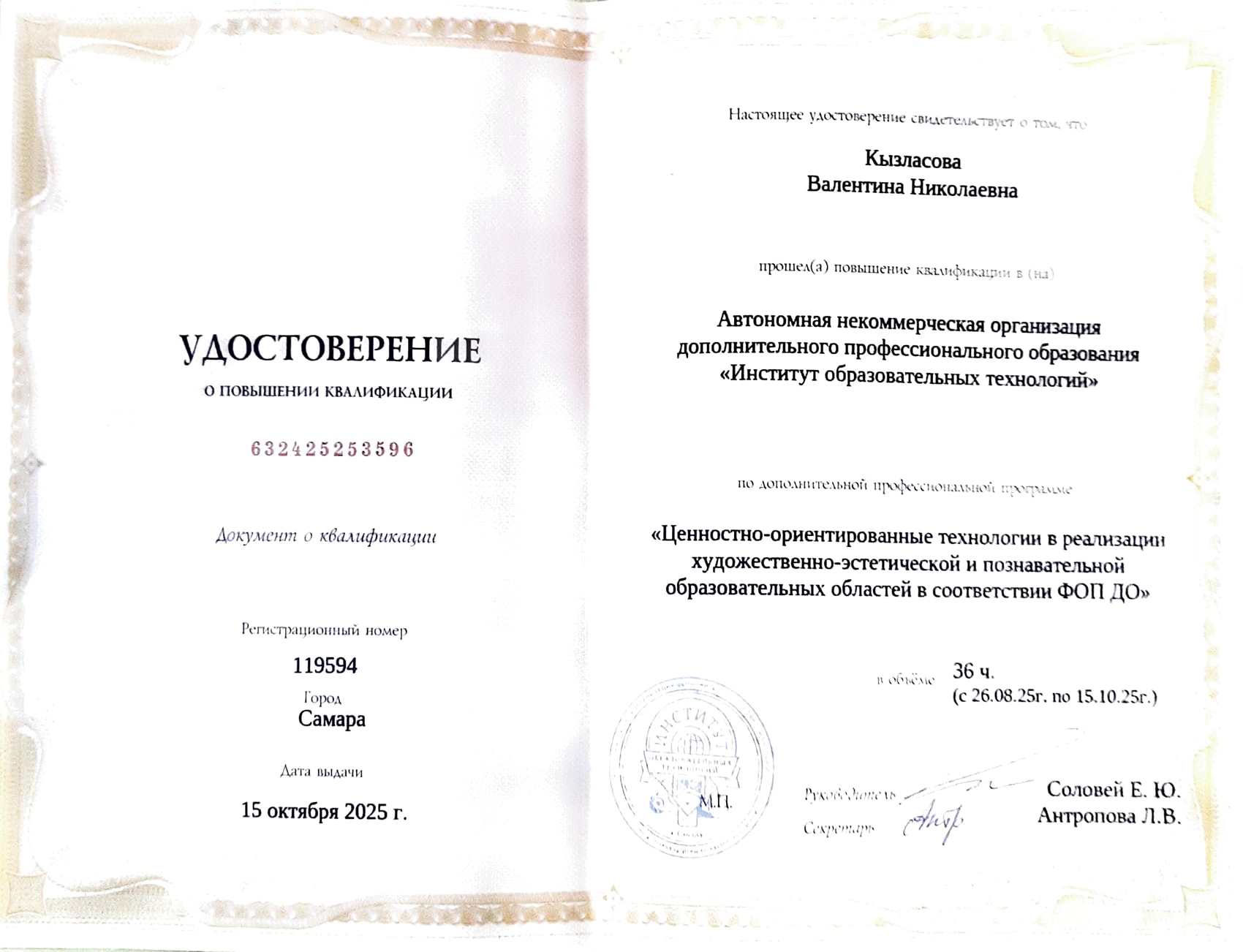 Удостоверение о повышении квалификации АНО ДПО "Институт образовательных технологий" по дополнительной профессиональной программе "Ценностно- ориентированные технологии в реализации художественно- эстетической и познавательной образовательных областей в соответствии ФОП ДО" 15.10.2025