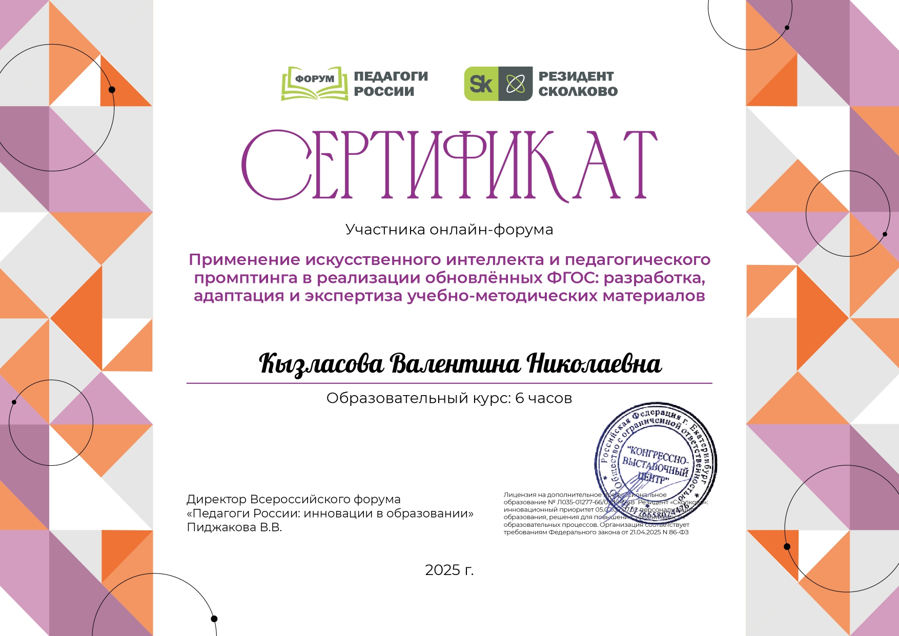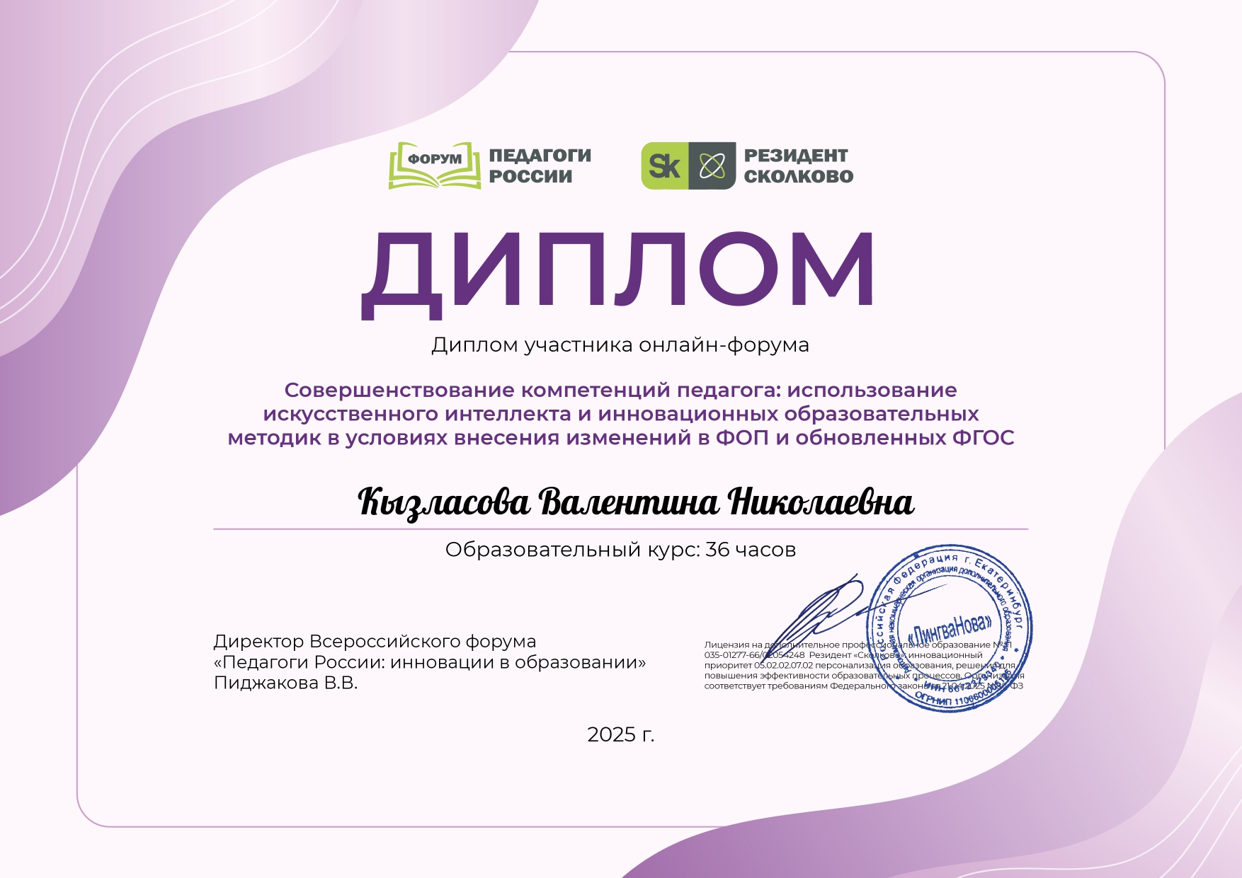Педагоги России: инновации в образовании. Диплом участника онлайн- форума совершенствование компетенций педагога: использование искусственного интеллекта и инновационных образовательных методик в условиях внесения изменений в ФОП и обновленных ФГОС 05.11.2025