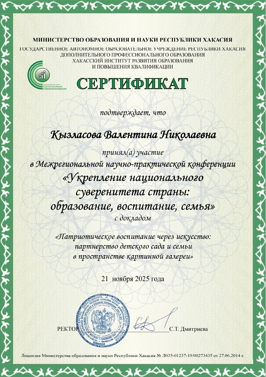 Сертификат приняла участие в Межрегиональной научно-практической конференции "Укрепление национального суверенитета страны: образование, воспитание , семья" с докладом "Патриотическое воспитание через искусство: партнерство детского сада и семьи в пространстве картинной галереи" 21.11.2025