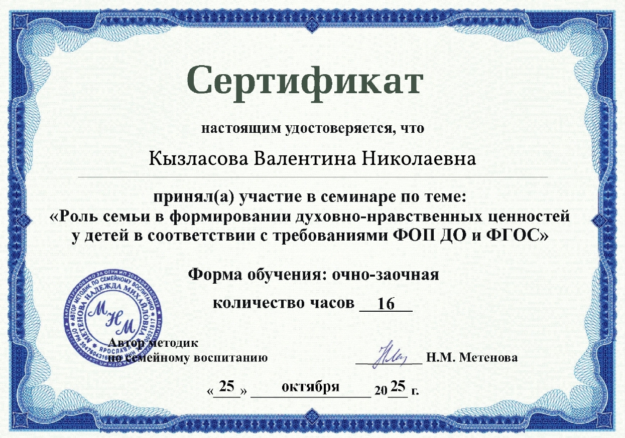 Сертификат "Роль семьи в формировании духовно- нравственных ценностей у детей в соответствии с требованиями ФОП ДО и ФГОС" 25.10.2025