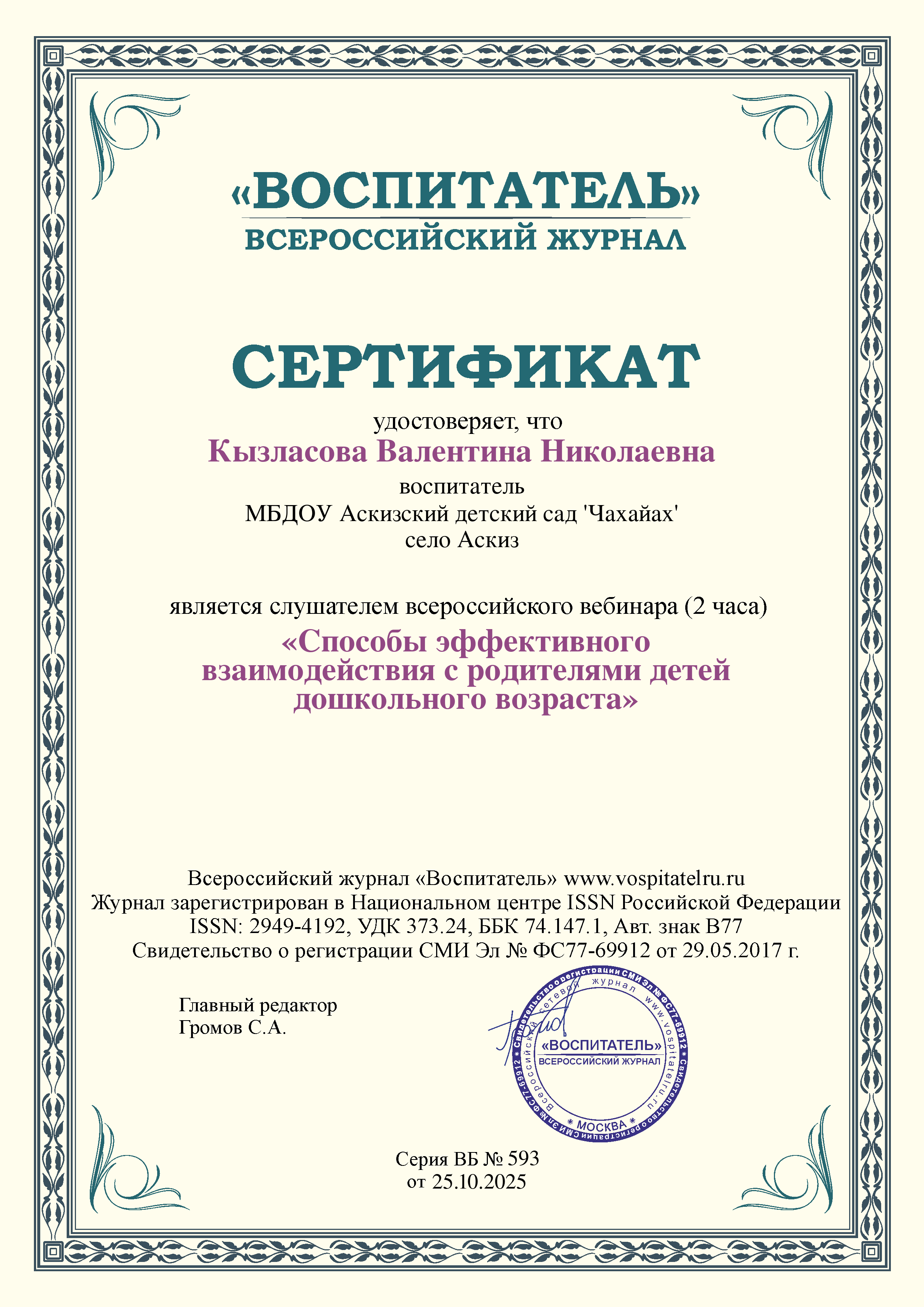 Сертификат "Способы эффективного взаимодействия с родителями детей дошкольного возраста" 25.10.25