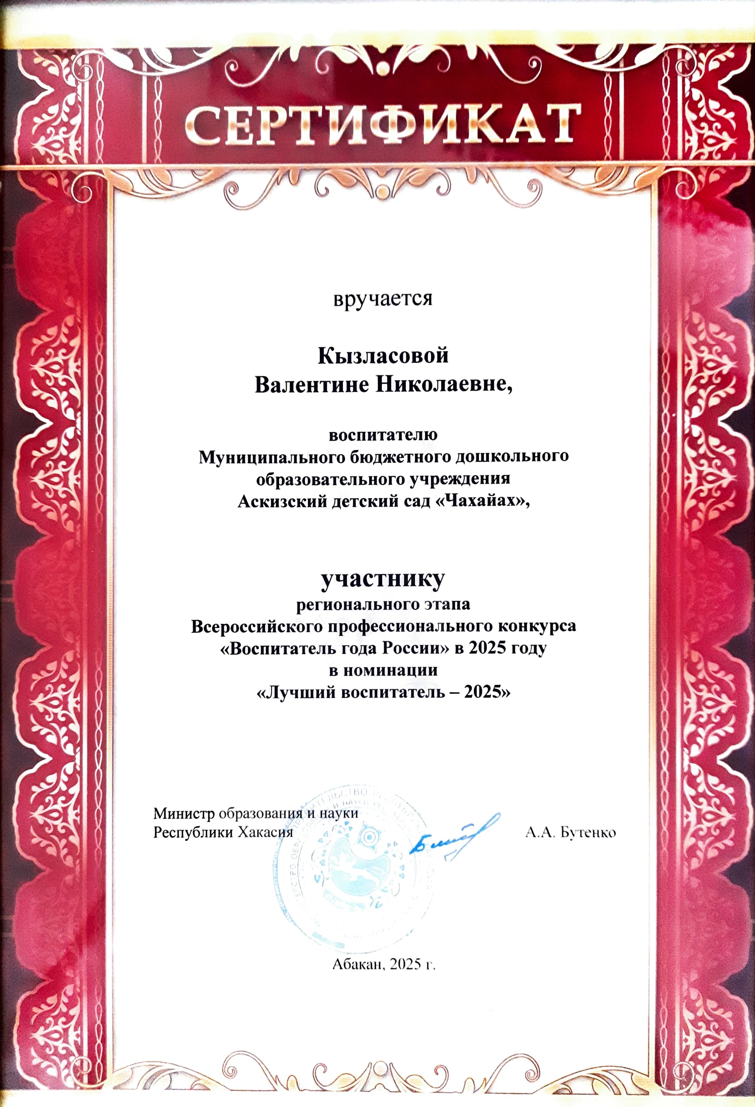 Сертификат Кызласовой Валентине Николаевне воспитателю МБДОУ Аскизский детский сад "Чахайах" председателю жюри