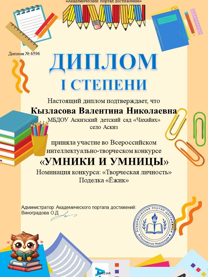 Диплом 1 степени награждается Кызласова Валентина Николаевна